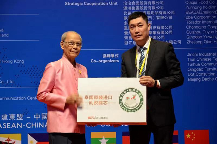 2019年9月4日,紅豆集團紅豆家紡公司應邀參加2019年東盟經貿發展(曼谷)合作論壇,紅豆家紡公司總經理錢振宇先生帶領一行人員參加此次會議,紅豆家紡首次走出國門,詮釋對健康水碾、舒適生活的全新定義,從而引領健康睡眠的需求。在此次會議上,紅豆家紡公司總經理向泰國旺猜親王進貢紅豆乳膠枕、紅豆襯衫,獲得皇室旺猜親王的高度評價,并授予紅豆集團紅豆家紡產品為“泰國皇室御用產品”。同時,錢振宇先生代表紅豆集團董事局主席兼CEO周海江,接受中泰國王勛章,中泰友好使者榮譽。
