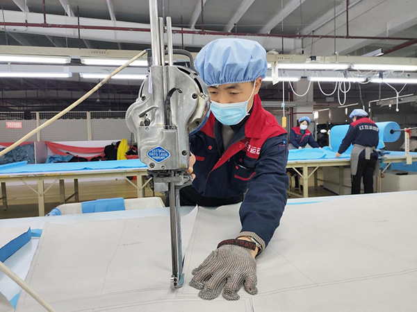 “沒有現(xiàn)成的提拉工具,就想其他辦法。先用鏟車把面料運(yùn)到指定區(qū)域,為提高效率,我們用2個(gè)板凳自制了工具,順利將面料快速送上裁剪臺。”錢學(xué)民笑著說。