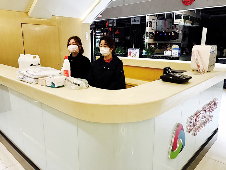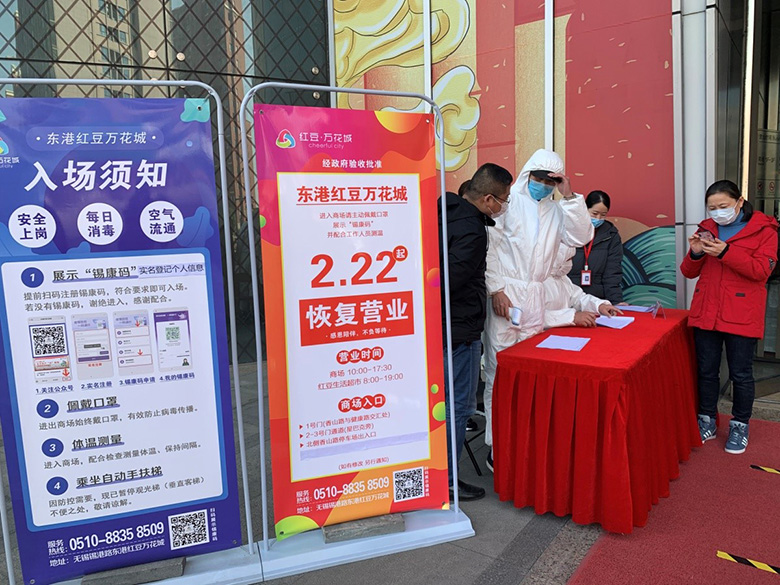 位于無錫的東港紅豆萬花城內(nèi)燈火輝煌,遍布4層樓的大小店鋪相繼開門營業(yè)?!?月末,無錫中山路紅豆萬花城、東港紅豆萬花城恢復(fù)營業(yè),我們按照政府相關(guān)規(guī)定要求進(jìn)入商城的顧客必須佩戴口罩,配合測溫、展示‘錫康碼’。本月,我們分布在無錫及鎮(zhèn)江的各紅豆萬花城商業(yè)綜合體都相繼恢復(fù)了營業(yè)?!?月27日上午,東港紅豆萬花城入口處,工作人員給兩位客人邊量體溫邊說,只見一邊,消毒用品、洗手液、紙巾等一應(yīng)齊全。