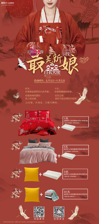 不知不覺(jué),2020年已經(jīng)過(guò)半,7月正值第20屆“紅豆七夕節(jié)”啟動(dòng)之際,紅豆家紡“尋找最美新娘”的活動(dòng)也緩緩拉開(kāi)序幕。無(wú)論開(kāi)年經(jīng)歷了多少磨難、多少坎坷,在2020年這樣注定不平凡的一年里,你應(yīng)該有很多動(dòng)人的故事要和我們分享吧,是抗疫前線不眠不休的白衣天使,還是因?yàn)橐咔楸黄确指簟⑼七t婚期的最美新娘?