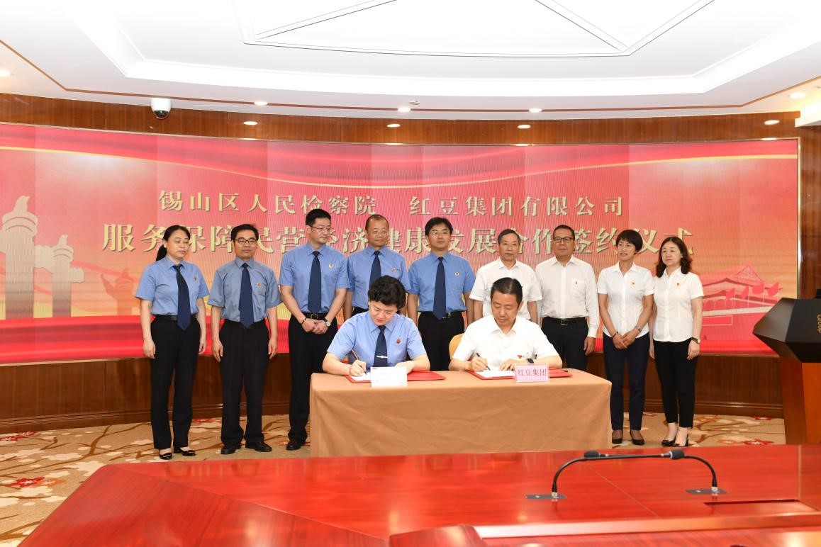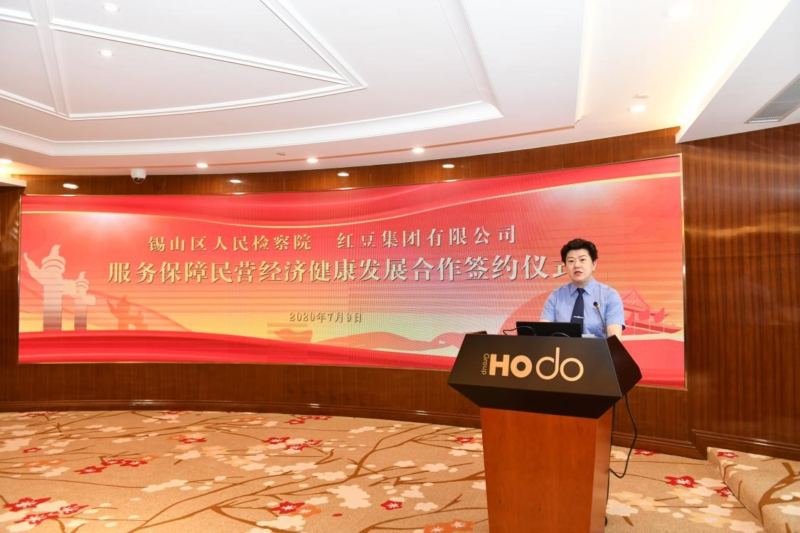 為深入貫徹習近平總書記在民營企業(yè)座談會上的重要講話精神,落實中央、省市委關于大力支持民營經(jīng)濟發(fā)展部署要求,充分發(fā)揮檢察機關職能,為民營經(jīng)濟提供優(yōu)質的法律服務和堅定的司法保障,7月9日,紅豆集團與錫山區(qū)人民檢察院在紅豆財富廣場北京廳進行服務保障民營企業(yè)健康發(fā)展合作備忘錄簽約。儀式上,紅豆集團黨委書記、董事局主席兼CEO周海江和錫山區(qū)人民檢察院何瑩檢察長代表雙方簽署合約。