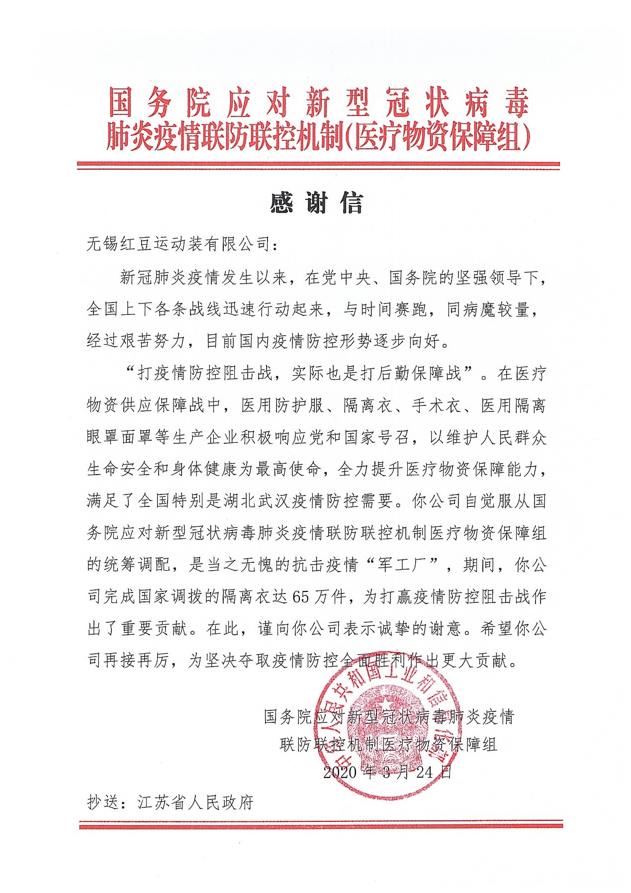 因為紅豆在抗擊疫情中作出的貢獻,國務(wù)院應(yīng)對新型冠狀病毒肺炎疫情聯(lián)防聯(lián)控機制(醫(yī)療物資保障組)給紅豆發(fā)來感謝信,稱贊紅豆為抗擊疫情當(dāng)之無愧的“軍工廠”。9月8日,在全國抗擊新冠肺炎疫情表彰大會上,周海江榮獲 “全國抗擊新冠肺炎疫情先進個人”“全國優(yōu)秀共產(chǎn)黨員”兩項殊榮,是同時獲得兩項殊榮的唯一民營企業(yè)家。